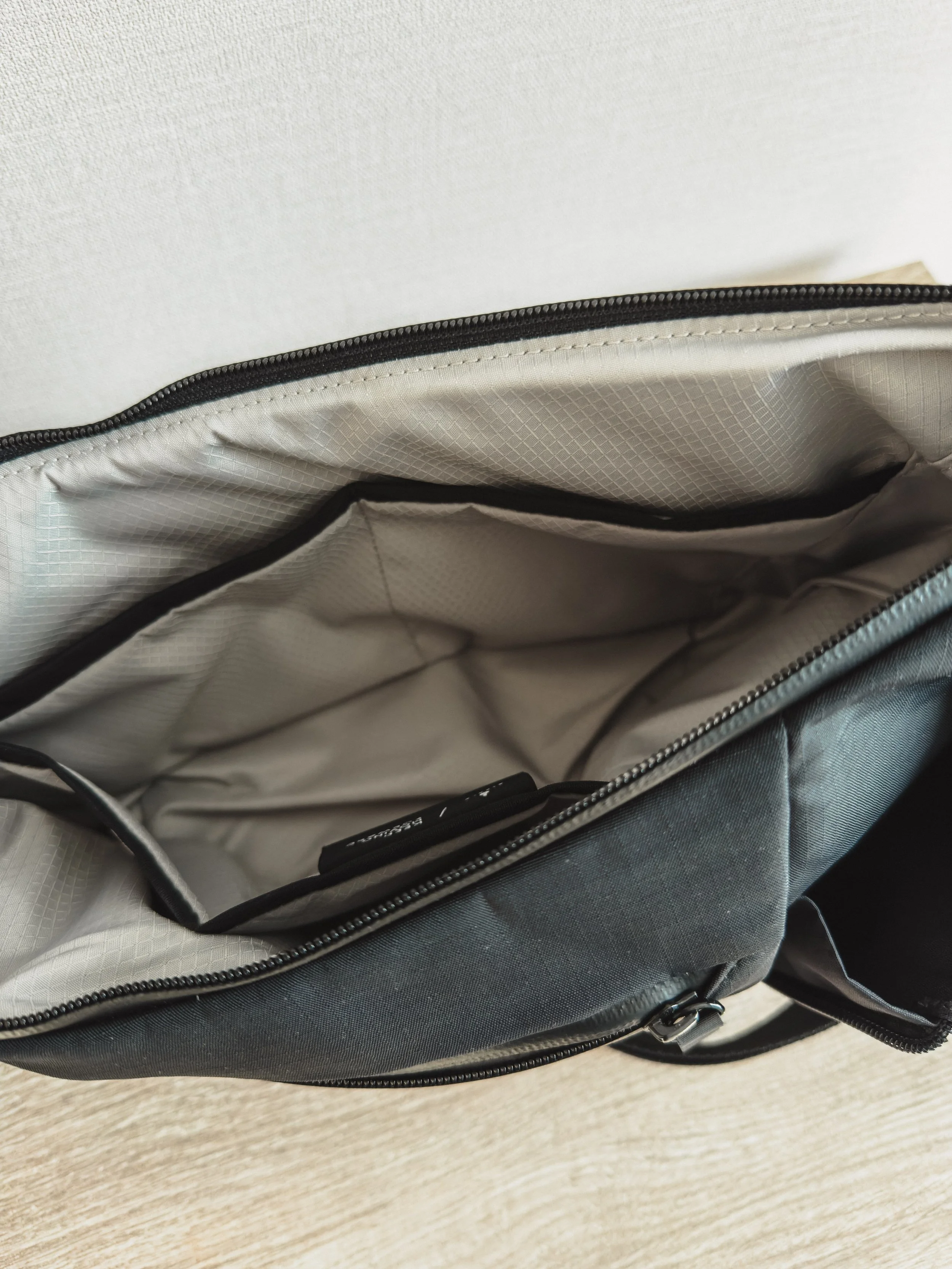 The main compartment has two PU-coated zippers that allow you to open the bag wide, providing clear access to your stuff. Inside, there are four almost full-depth drop pockets along the perimeter of the bag. While the pockets are not made of stretchy mesh, they still have some “stretchiness” to them. The primary area of the compartment allows you to carry bigger items, like an umbrella or a Kindle in a bulky case. However, it should be noted that, since the bag tapers at the top, you won’t be able to fill it to the brim and close it. So the extra space at the top of the compartment is better treated as breathing room for easier navigation inside the bag.