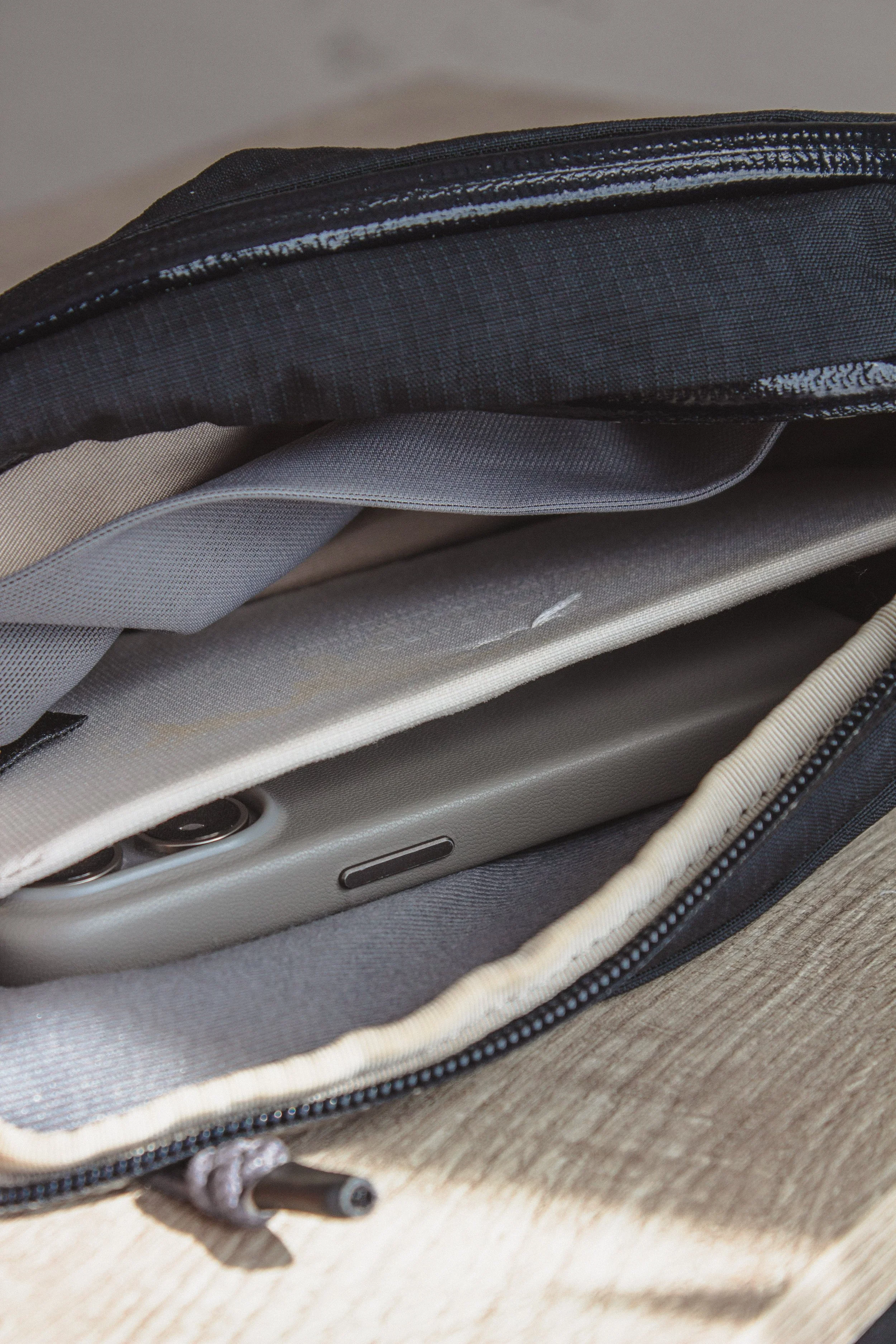 The front compartment is divided into two sections with a gusset. One of the sections features a key leash. I find this configuration clever, as other bags have key leashes attached in the same pocket where you would store your other potentially scratch-prone items. Here, on the Venture Ready Sling, keys have their own dedicated space that can be accessed quickly and where keys won’t mingle with other stuff. The second section is a good place for smaller items, such as AirPods and a pack of tissues.