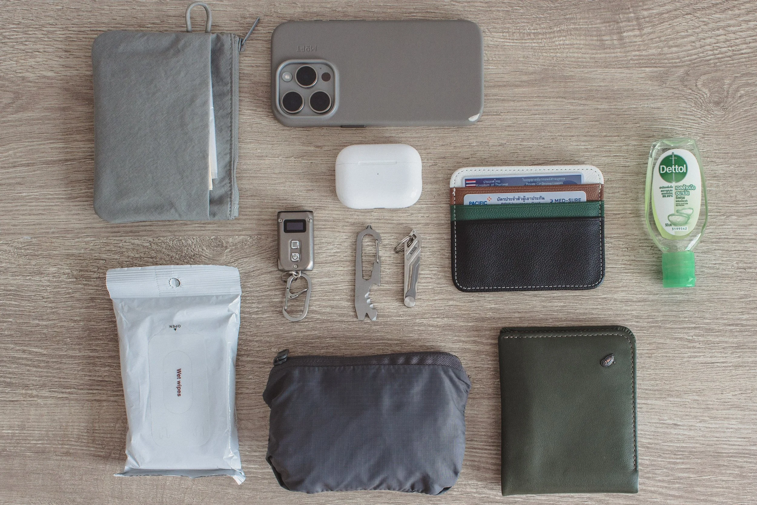 Here is what I had in the fully packed sling: Muji medication pouch, iPhone 15 Pro, AirPods Pro, wet wipes, a packable tote, Bellroy Hide & Seek wallet, cardholder, hand sanitizer, Nitecore Tiny 2 TI flashlight on Nite Ize #1 carabiner, Nite Ize DoohicKey multitool, Nitecore NTK05 knife.